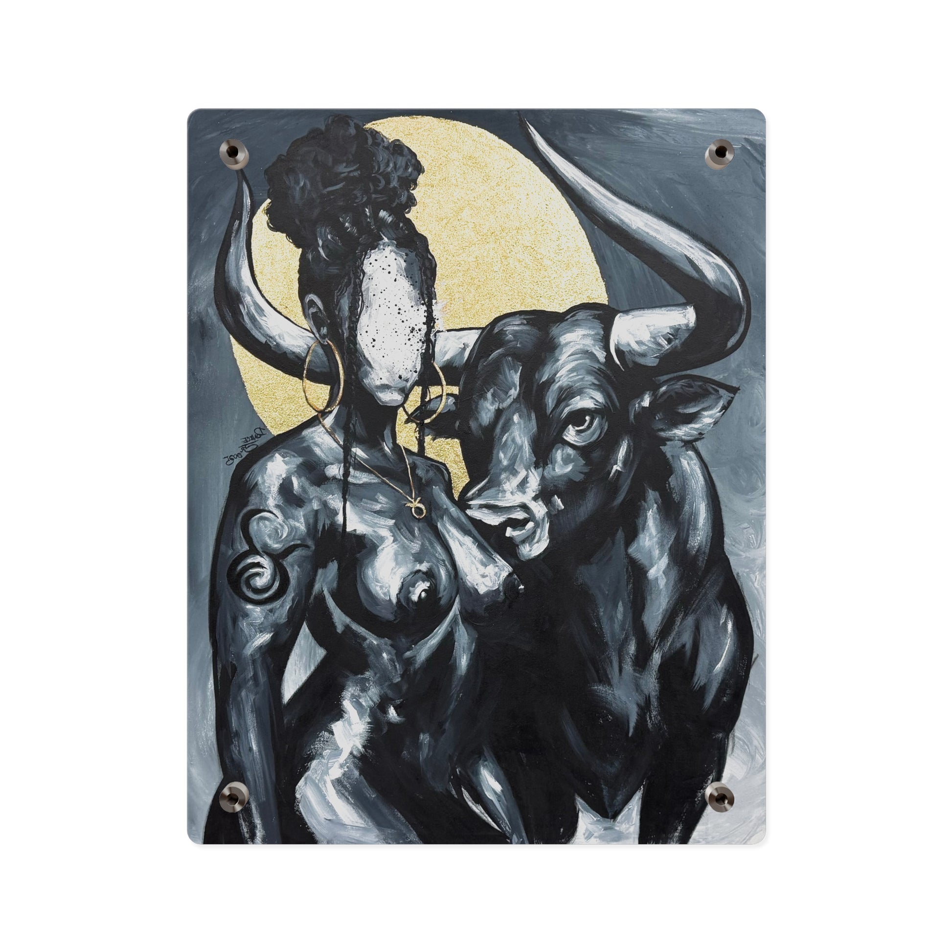 Acrylic wall art panels that bring bold, contemporary energy to indoor spaces. The transparent, glossy surface deepens contrast and makes the metallic gold background pop, while the white vinyl backing preserves the artwork’s vibrancy. Mounted on sleek brushed silver stand-offs, the panel floats off the wall and casts a subtle shadow that adds depth to gallery walls, entryways, or living rooms. The image — a dramatic, figurative composition with strong brushwork and a luminous gold halo — feels both mythic and intimate, inviting close viewing and quiet conversation. Hang it vertically, horizontally, or as part of a curated cluster to amplify a modern, art-forward interior.