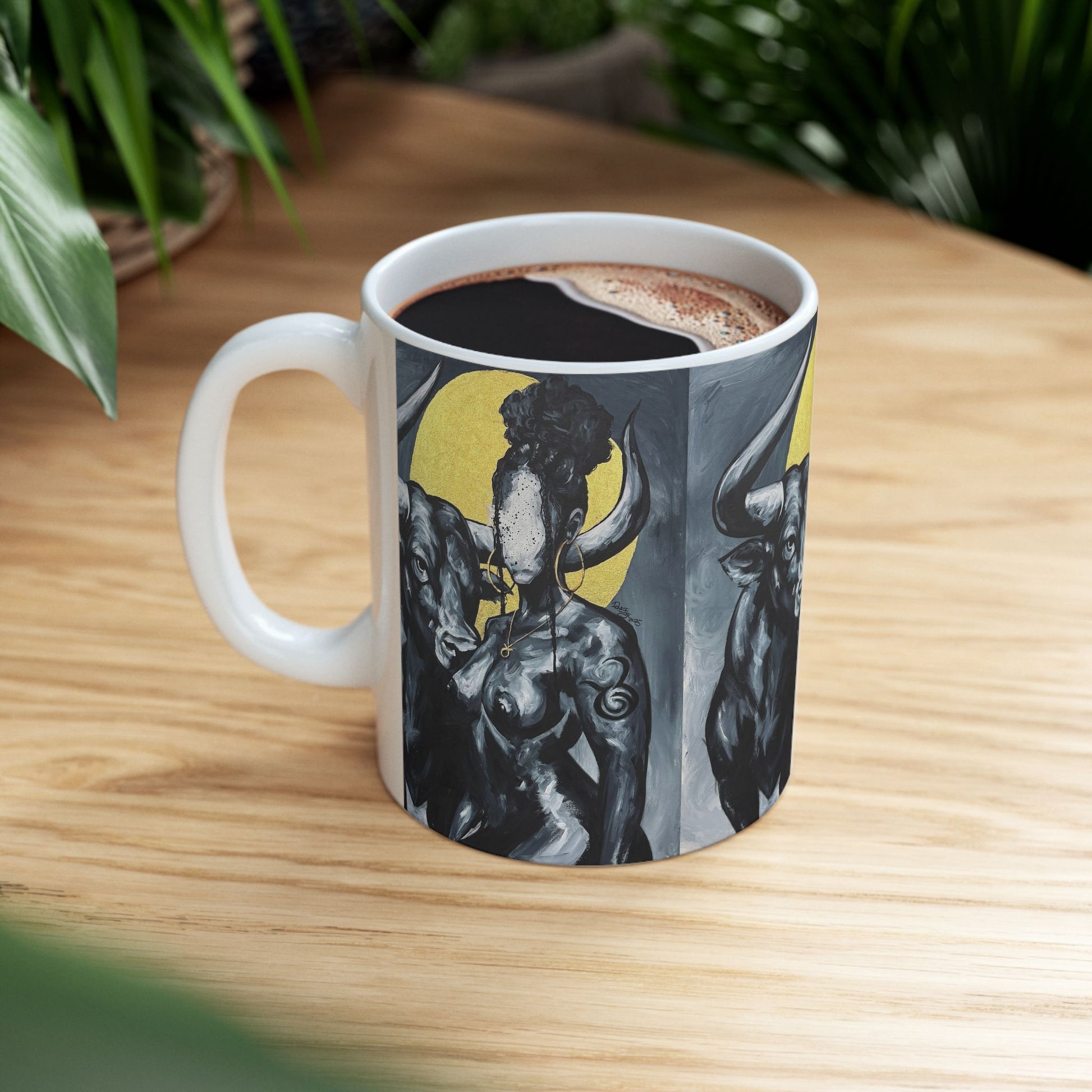 This glossy ceramic mug brings a moody, mythic scene to your everyday rituals. A bold, painterly image wraps around the white ceramic — a powerful bull beside a shadowed, tattooed figure against a warm golden moon. The contrast of deep grays and inky blacks with a single luminous circle makes each sip feel like a quiet, intimate moment of reverie. It’s the kind of mug you reach for when you want something that speaks to strength, mystery, and thoughtful mornings. Dishwasher- and microwave-safe, with a comfortable C-handle and bright, lasting color, it’s built to be used and admired daily.