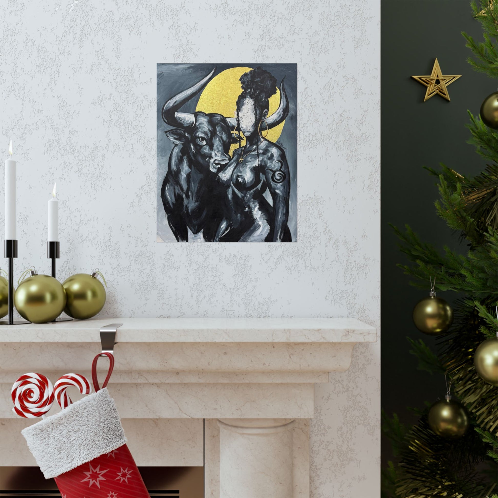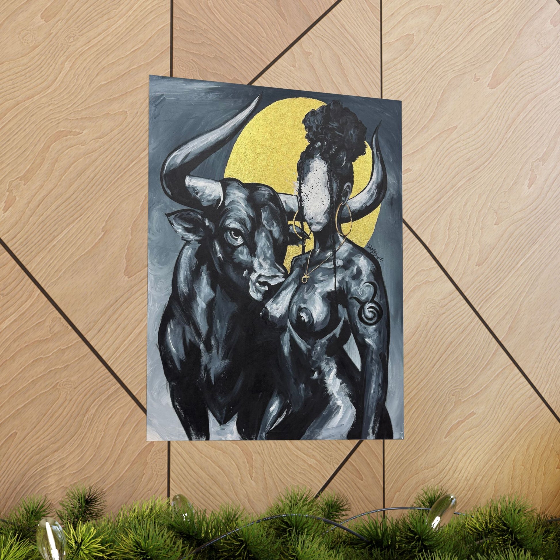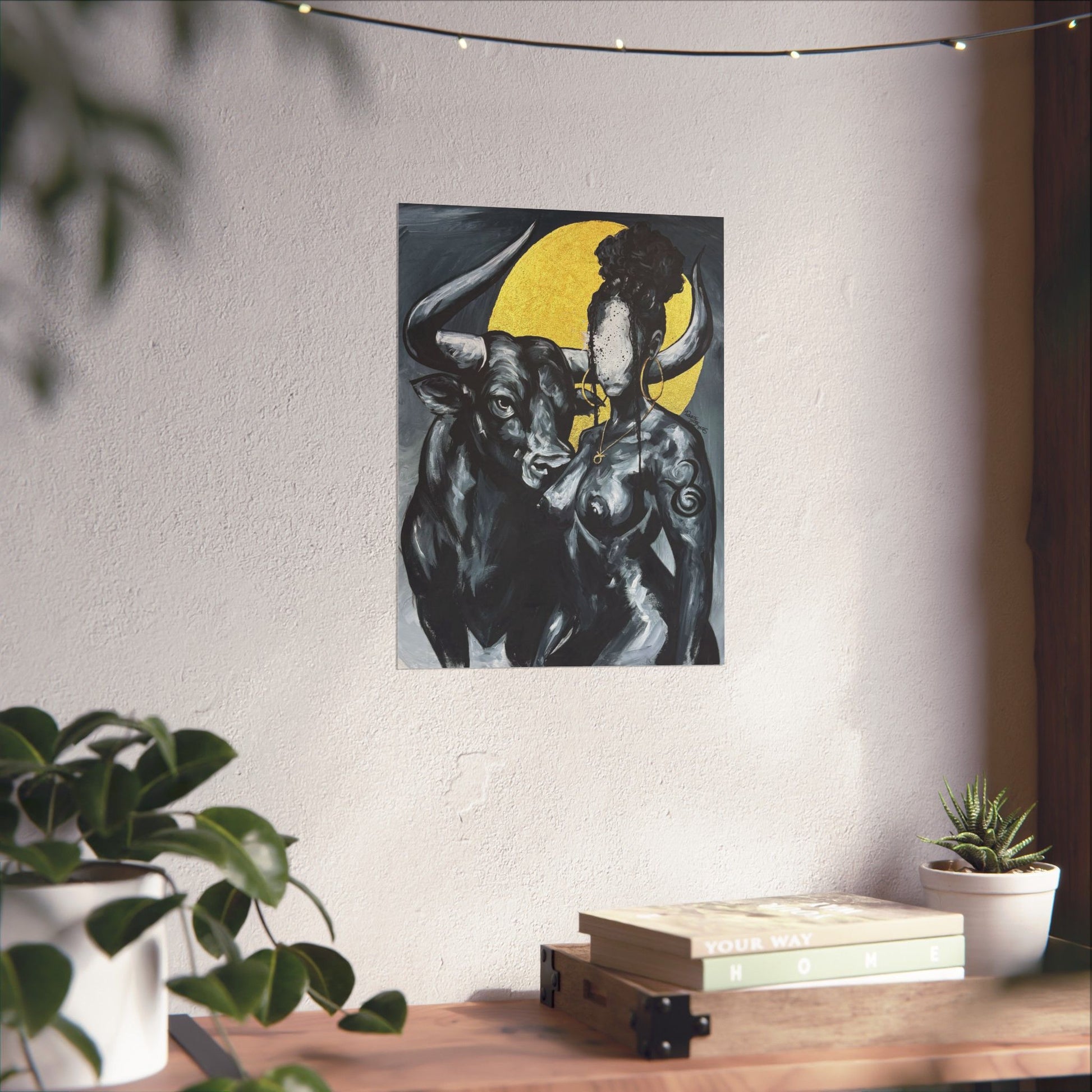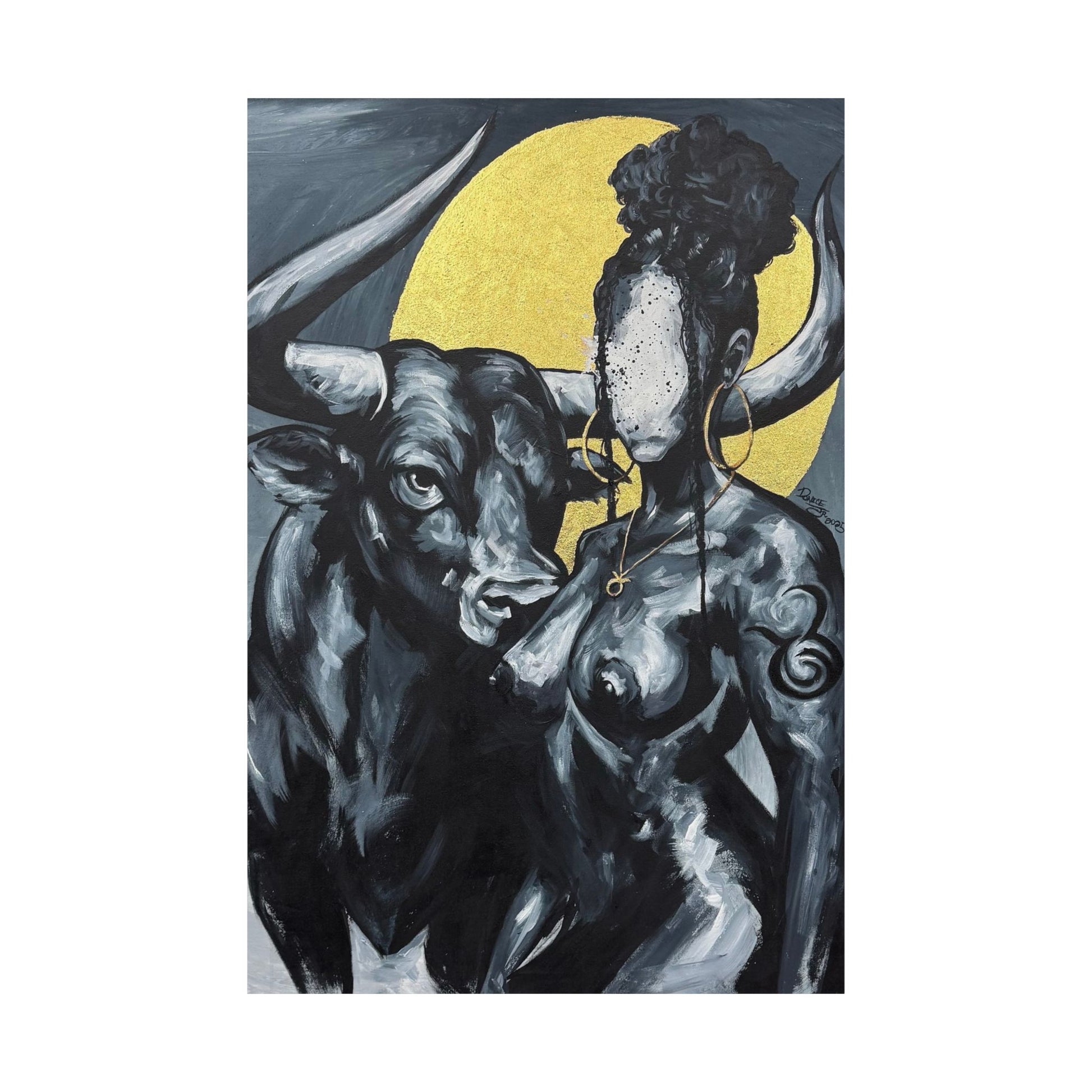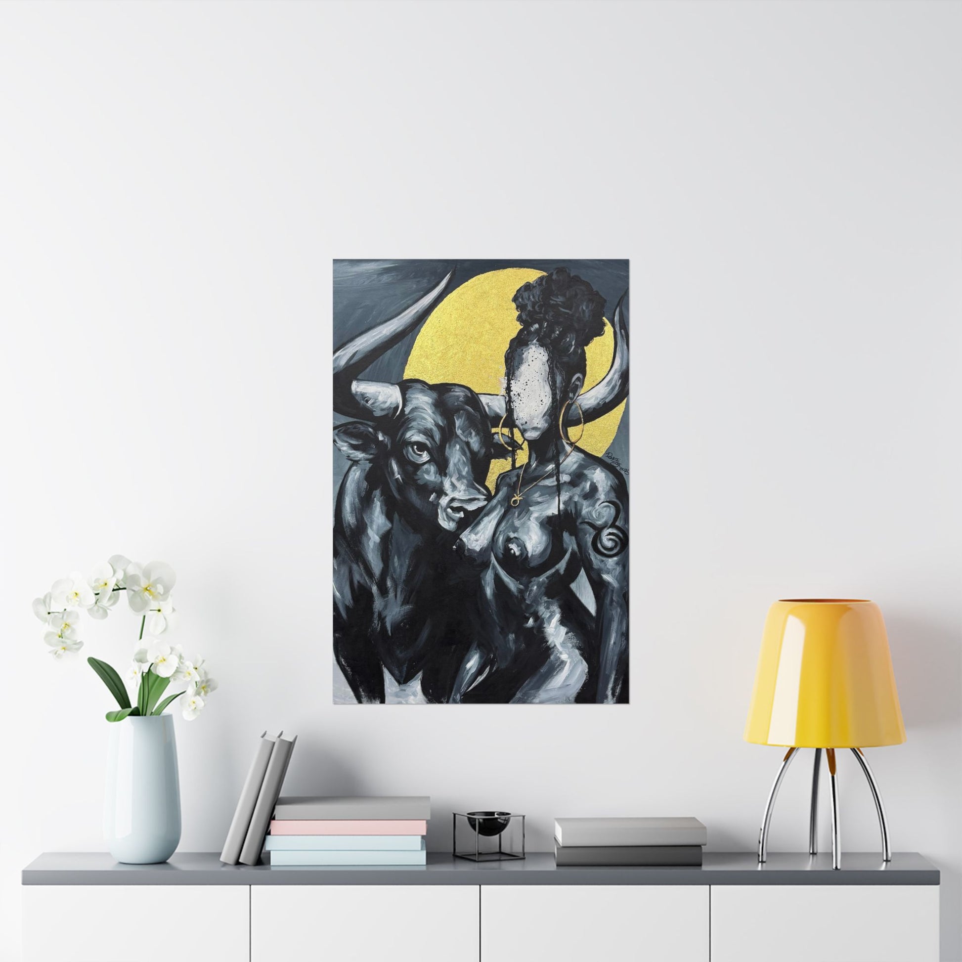 This matte vertical poster brings a quiet, powerful scene into your room — a bold monochrome study of strength and myth. A faceless woman and a steady bull stand against a soft golden halo, painted with rich giclée color and printed on archival museum-grade paper. The matte finish soaks up glare and gives the brushwork a tactile, gallery-like presence on your wall. Hang it in a reading nook, studio, or entryway to add a contemplative, artful pulse to the space.