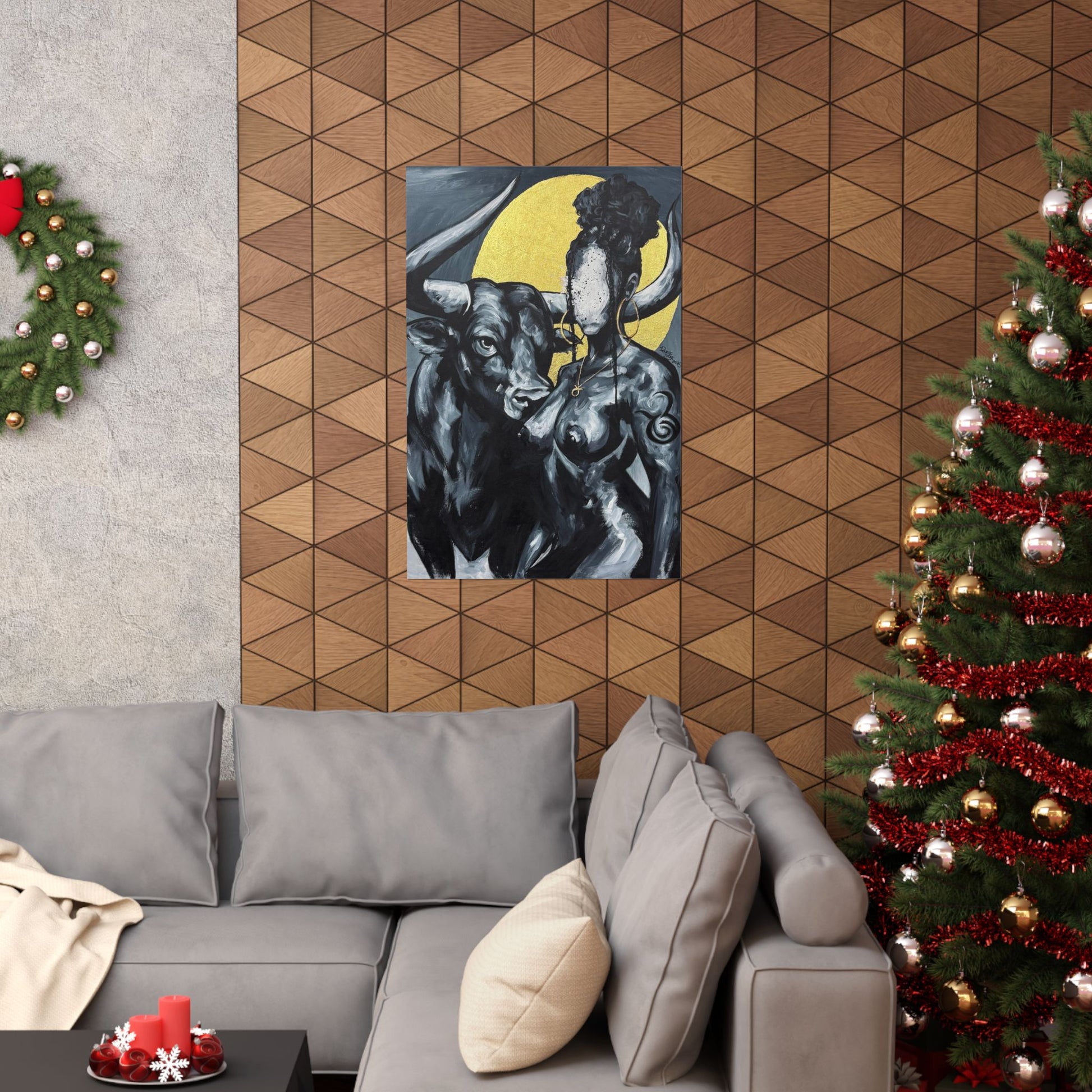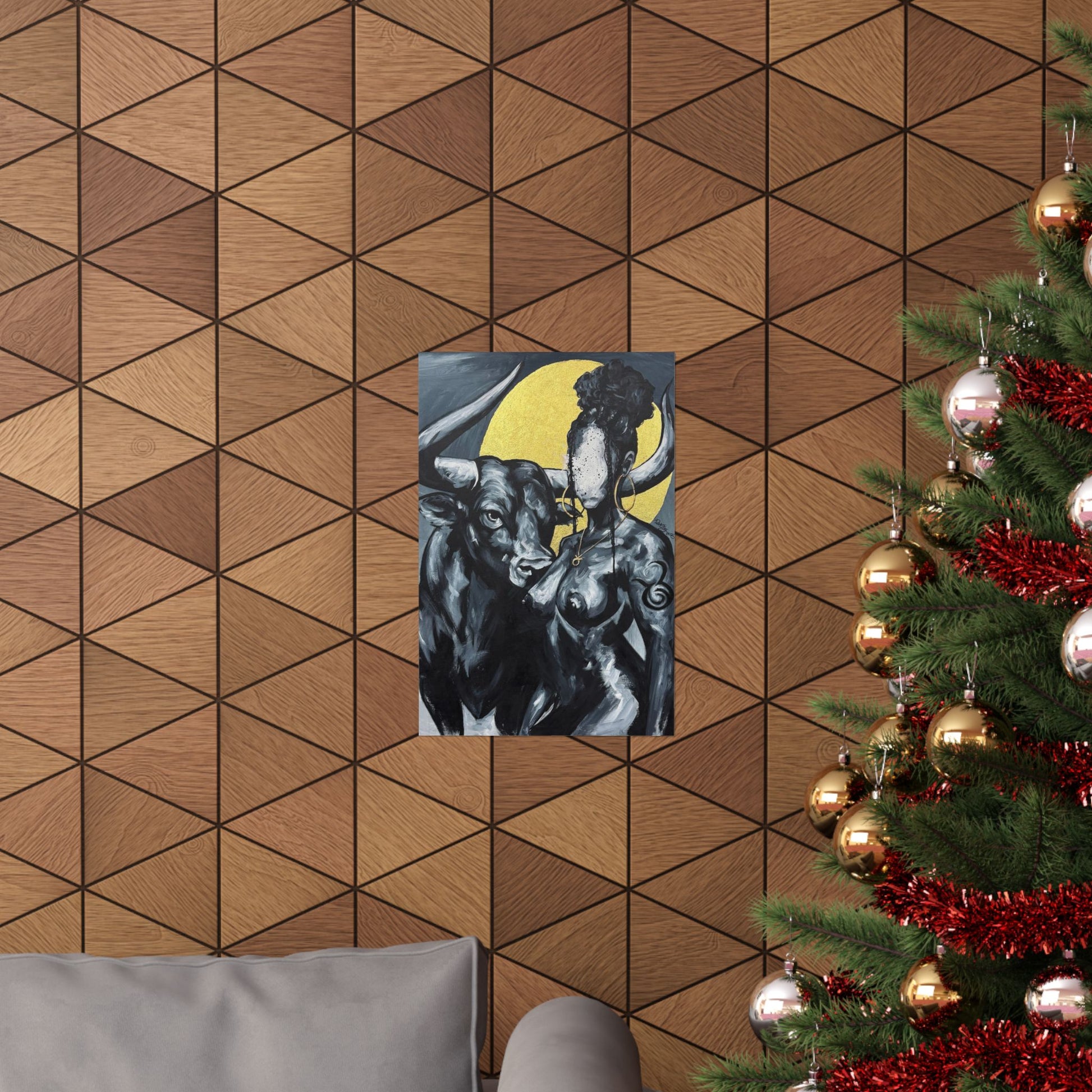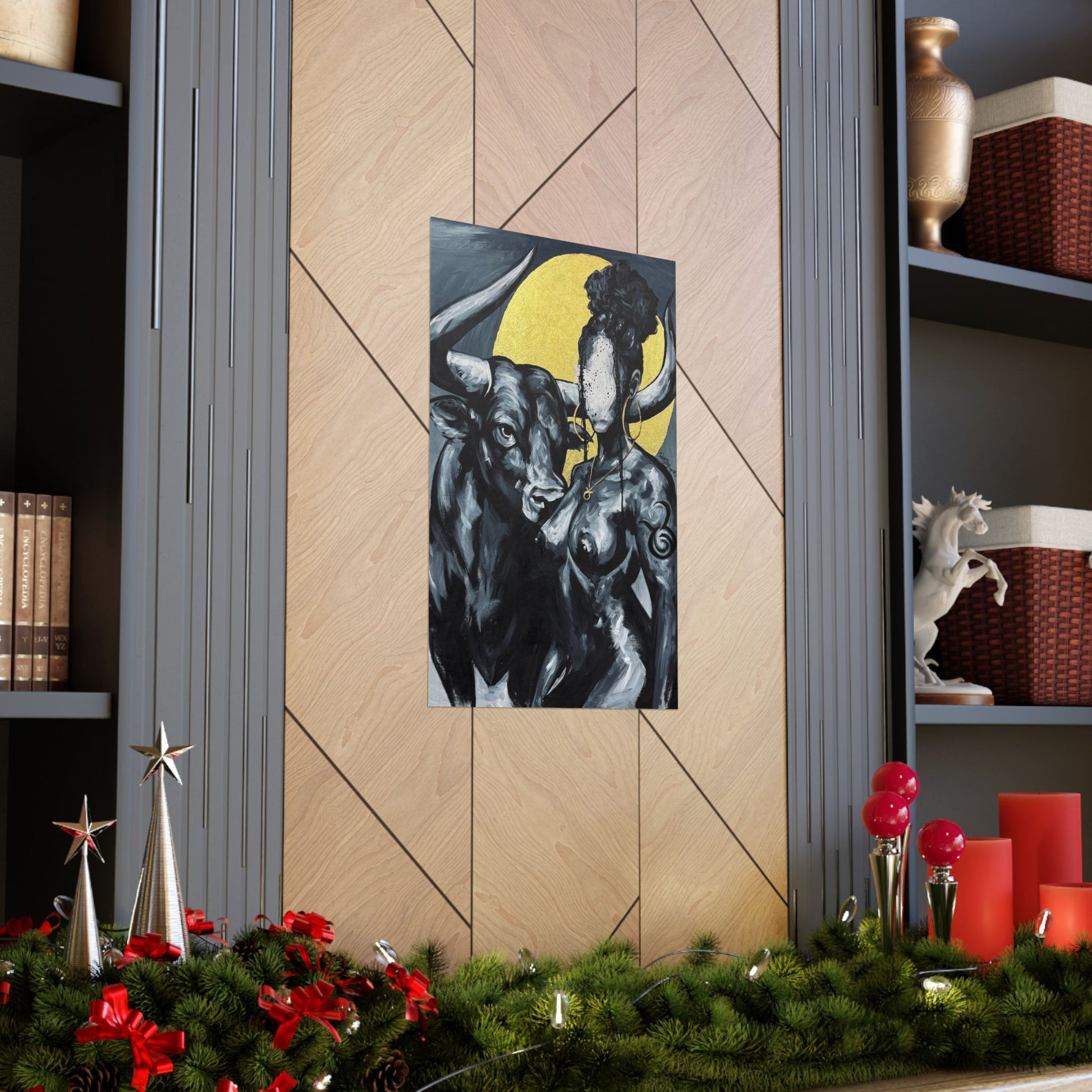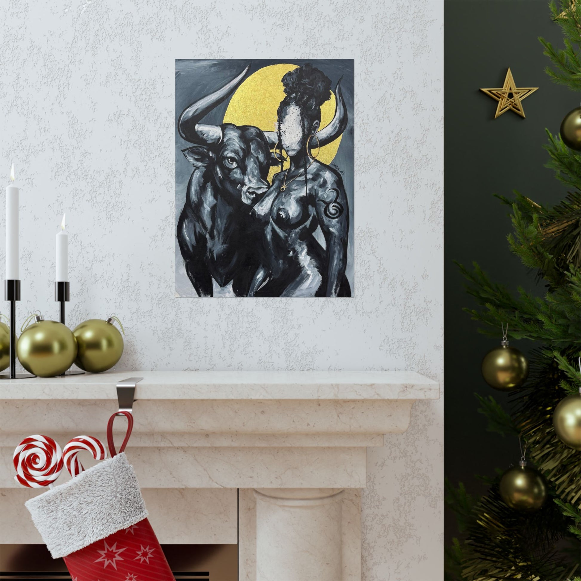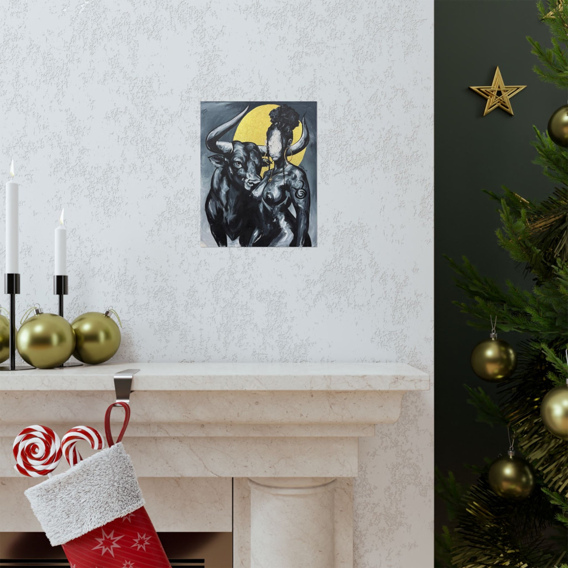 This matte vertical poster brings a quiet, powerful scene into your room — a bold monochrome study of strength and myth. A faceless woman and a steady bull stand against a soft golden halo, painted with rich giclée color and printed on archival museum-grade paper. The matte finish soaks up glare and gives the brushwork a tactile, gallery-like presence on your wall. Hang it in a reading nook, studio, or entryway to add a contemplative, artful pulse to the space.