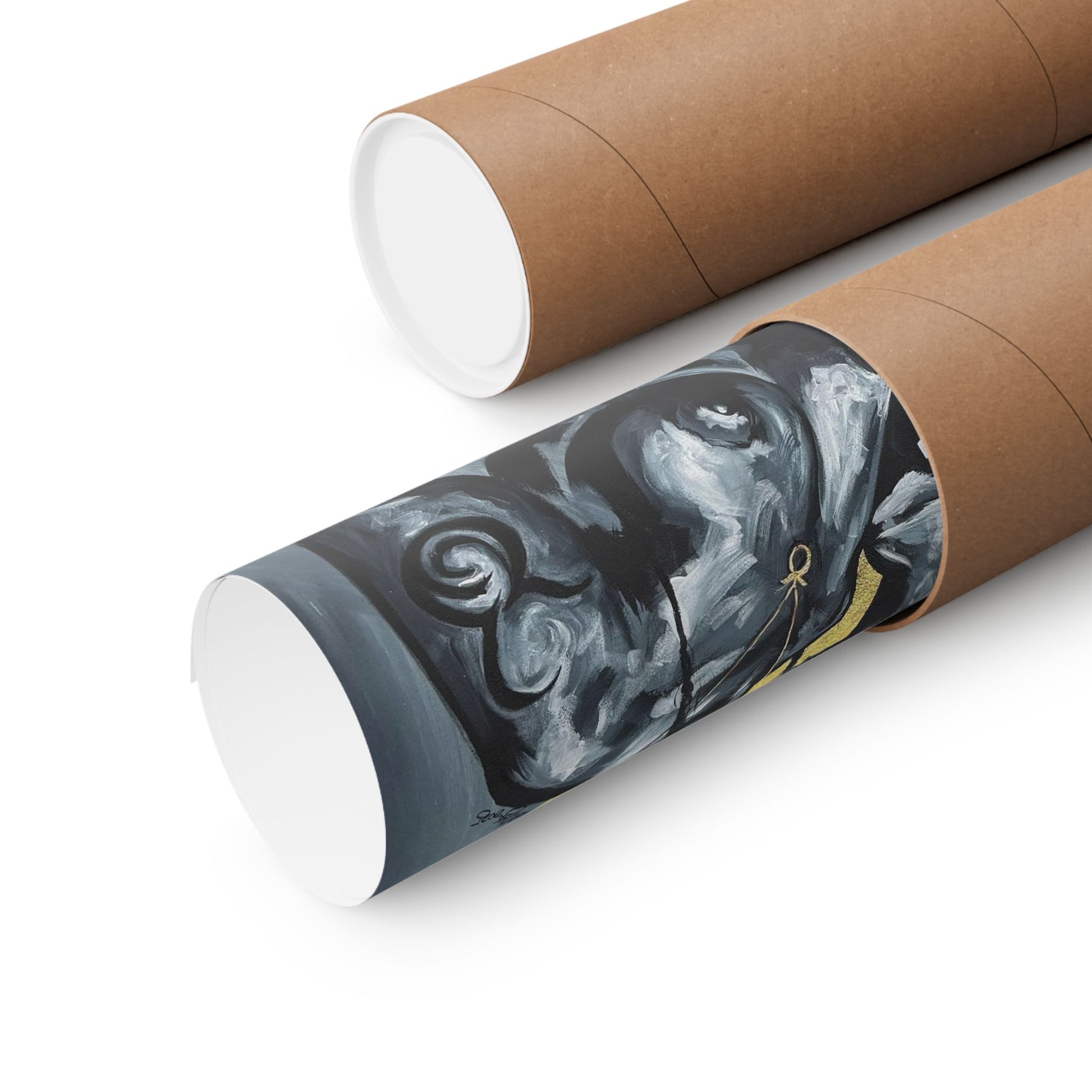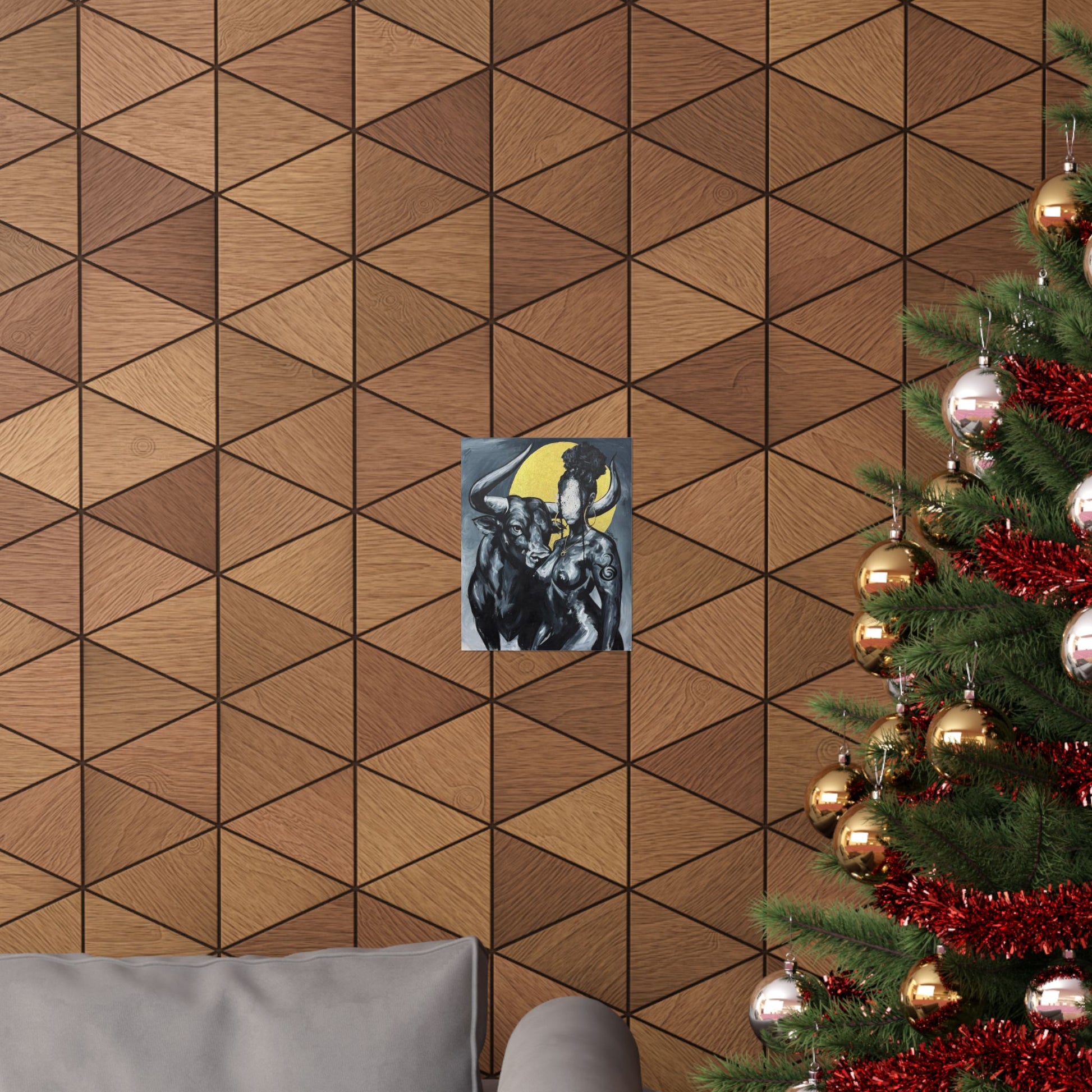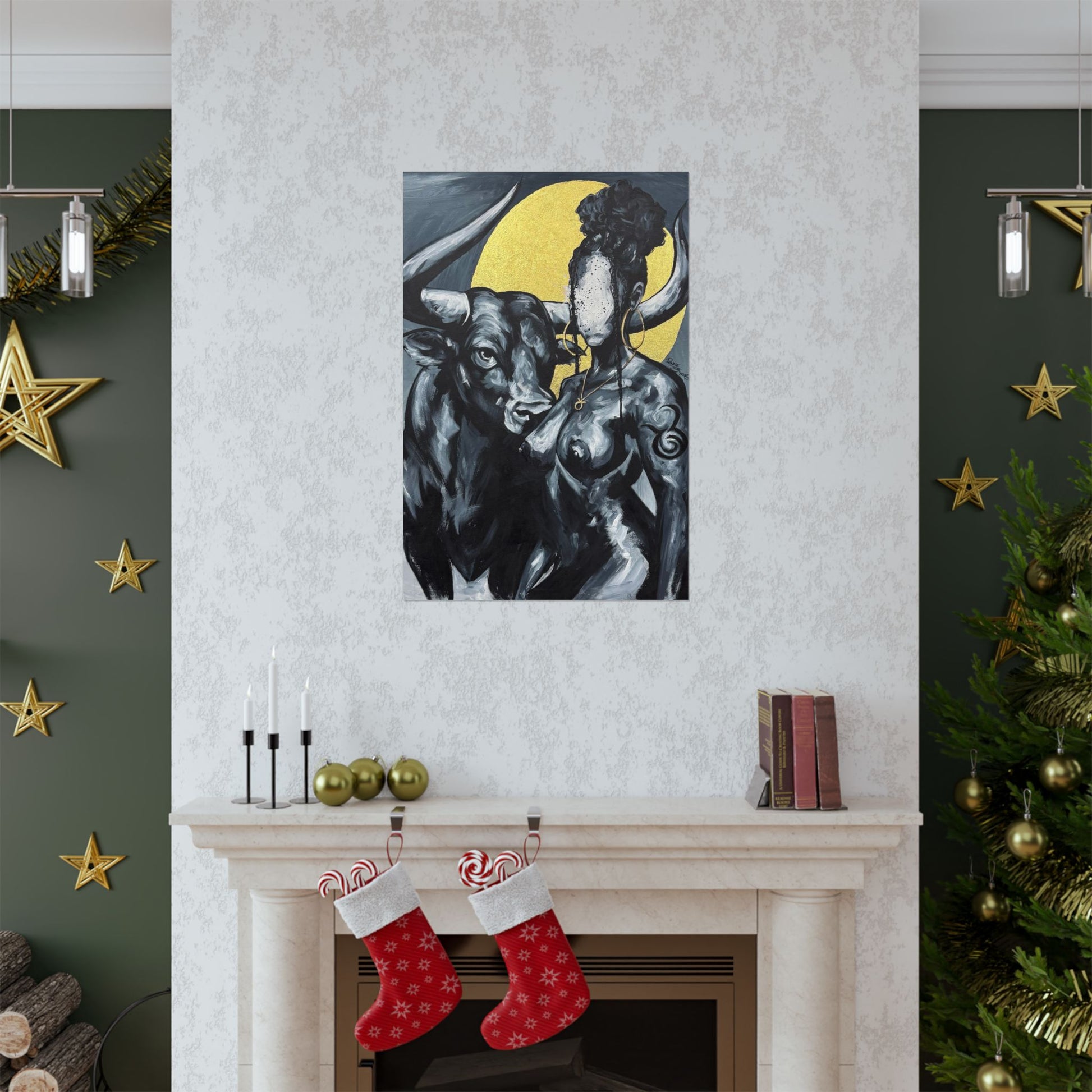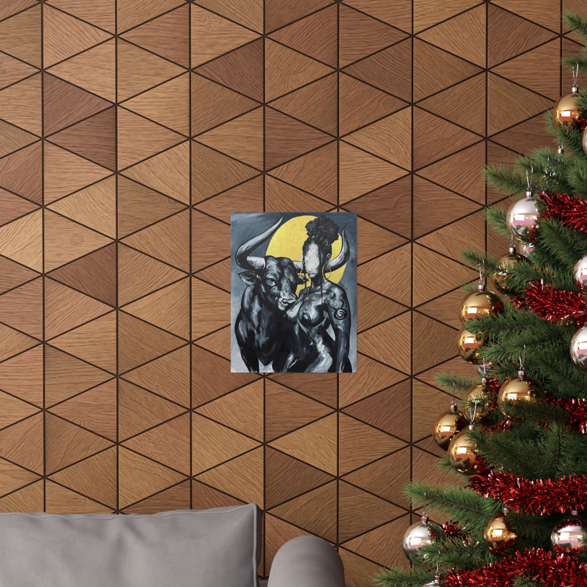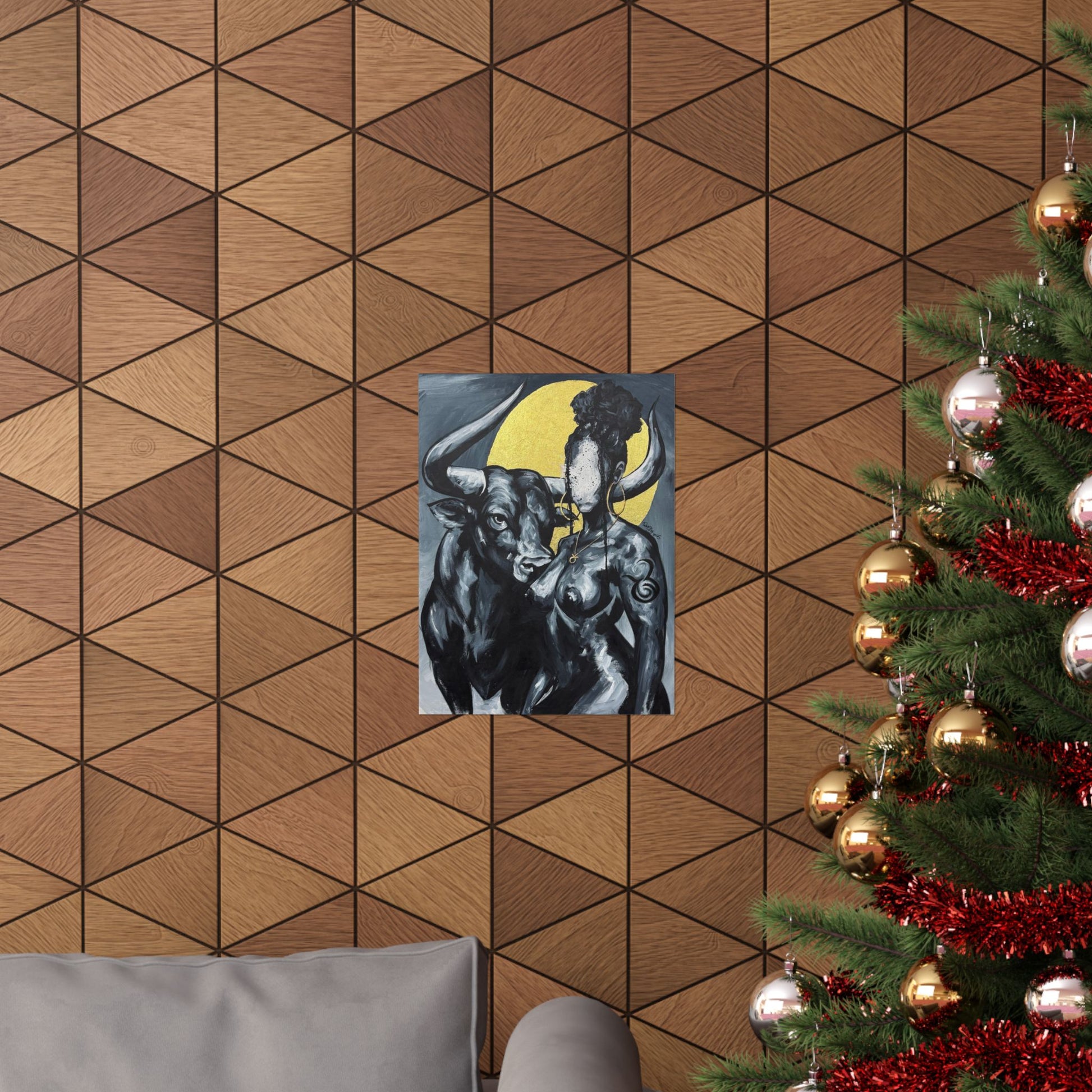 This matte vertical poster brings a quiet, powerful scene into your room — a bold monochrome study of strength and myth. A faceless woman and a steady bull stand against a soft golden halo, painted with rich giclée color and printed on archival museum-grade paper. The matte finish soaks up glare and gives the brushwork a tactile, gallery-like presence on your wall. Hang it in a reading nook, studio, or entryway to add a contemplative, artful pulse to the space.
