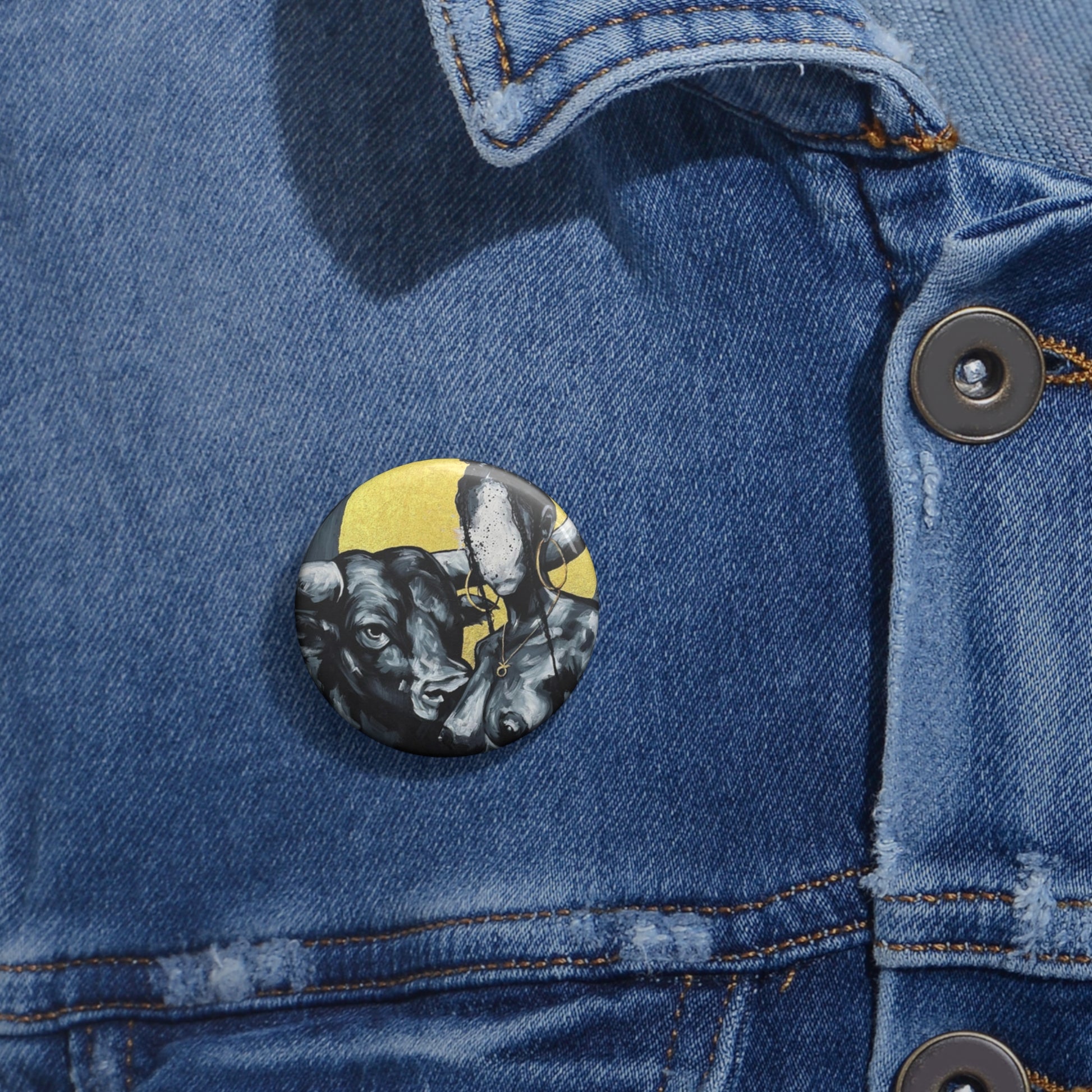 These glossy pin buttons bring a bold, art-forward accent to jackets, bags, and canvas totes. The rich, high-contrast illustration—rendered in deep charcoal tones against a warm yellow halo—reads like a tiny handheld print. When you clip one on a denim jacket lapel or a canvas strap it adds a quietly rebellious, gallery-ready touch. They sit low-profile but speak loudly: wearable art that ages well thanks to a scratch- and UV-resistant mylar face and sturdy steel pin back. Assembled in the USA and offered in three sizes, these buttons are for people who collect small statements and like to layer meaning into everyday outfits or displays.